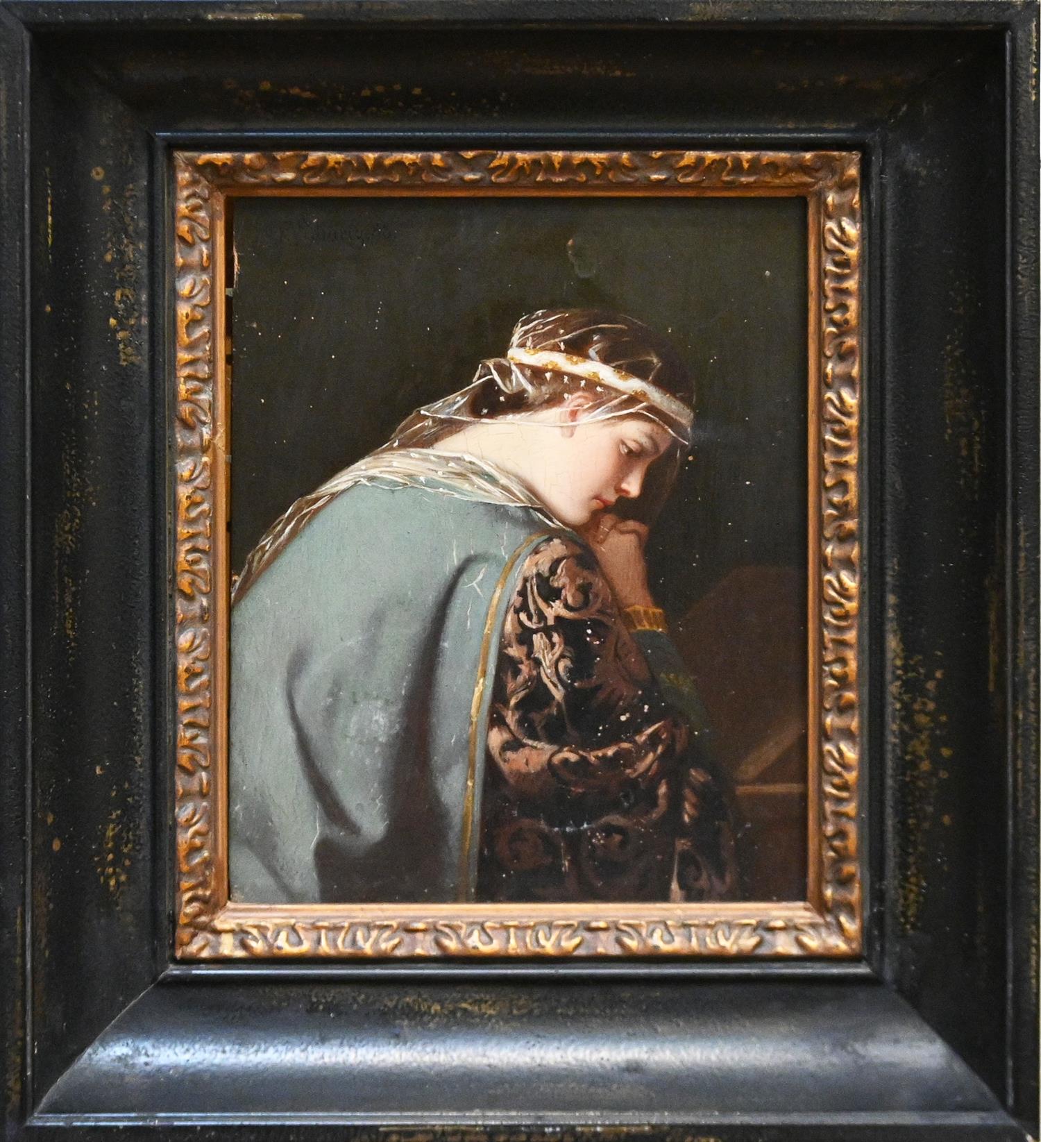 Some flecks of foreign matter across,. Paint cracking across, most evident in central area (white pigment). Wear to varnish and minor abrasions across. Work has slipped in frame exposing left hand side of panel.