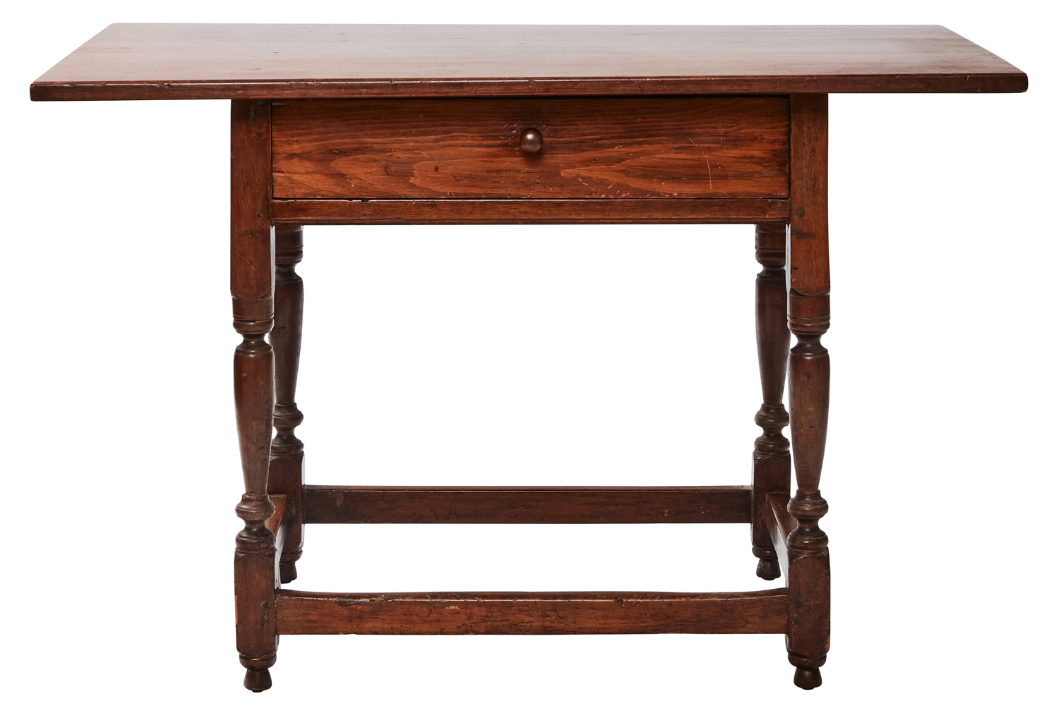 Early 19th century, the rectangular top above a frieze drawer, on turned legs joined by stretchers.