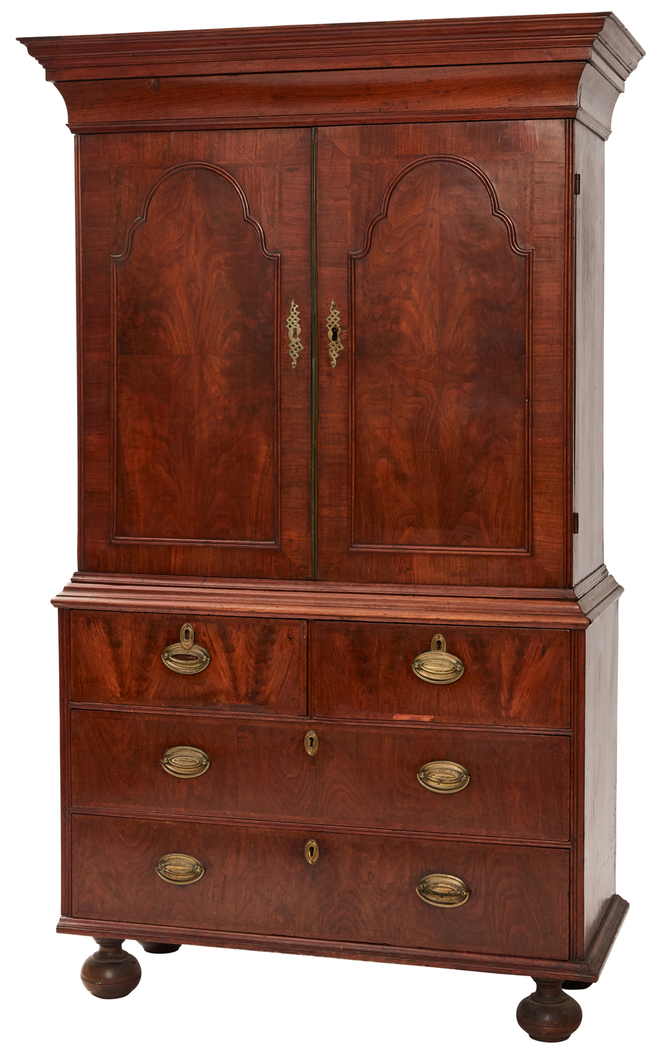 The moulded cornice with concealed drawer above a pair of arch panelled doors with cross- and feather- banded inlay enclosing shelves, the base with two short above two long feather-banded drawers on bun feet.