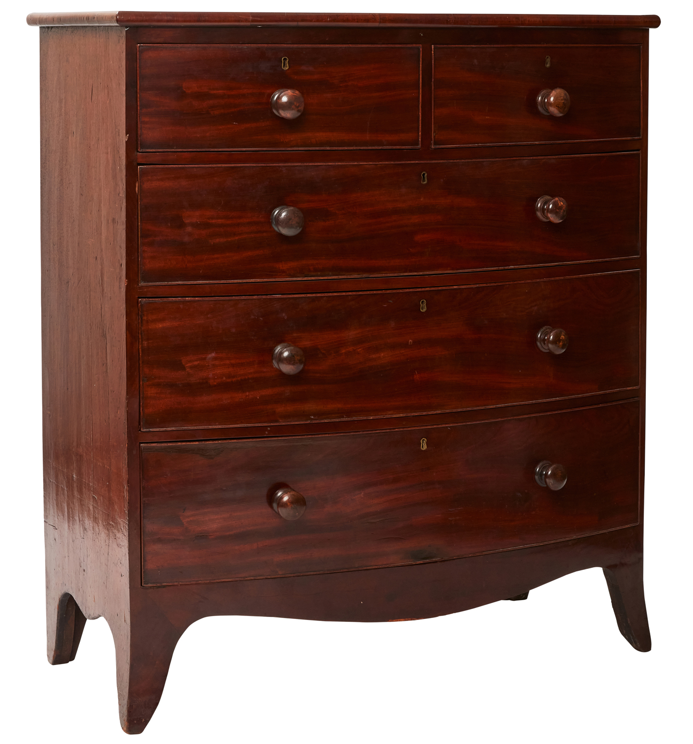 Having two short above three long drawers on swept bracket feet.