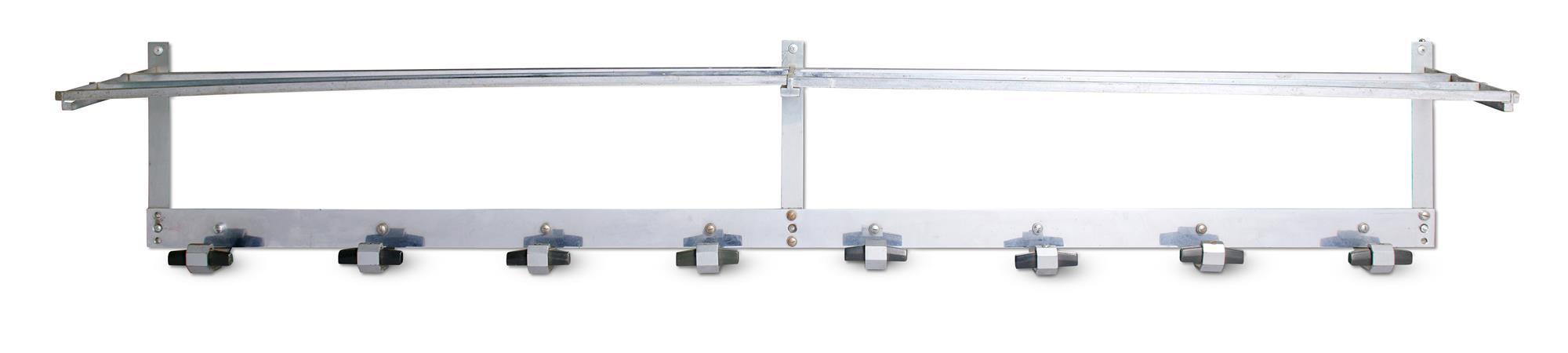 Wall mounted nickel plated coat rack with eight bakelite hooks.