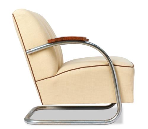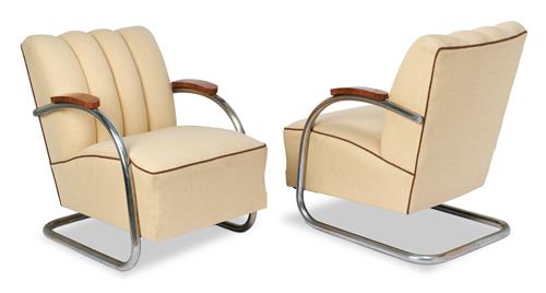 Cantilevered armchairs, on nickel plated frame with polished timber arms. Re-upholstered in linen fabric.
