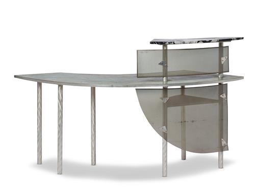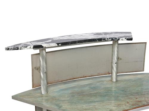 Surface scratches and marks across the body of the desk consistent with age and use. Small repair to black marble shelf. Structurally sound.