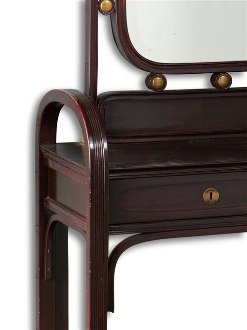 Bentwood stained beech with double drawers and decorative brass decoration. Deep bevelled mirrors with brass sabots.