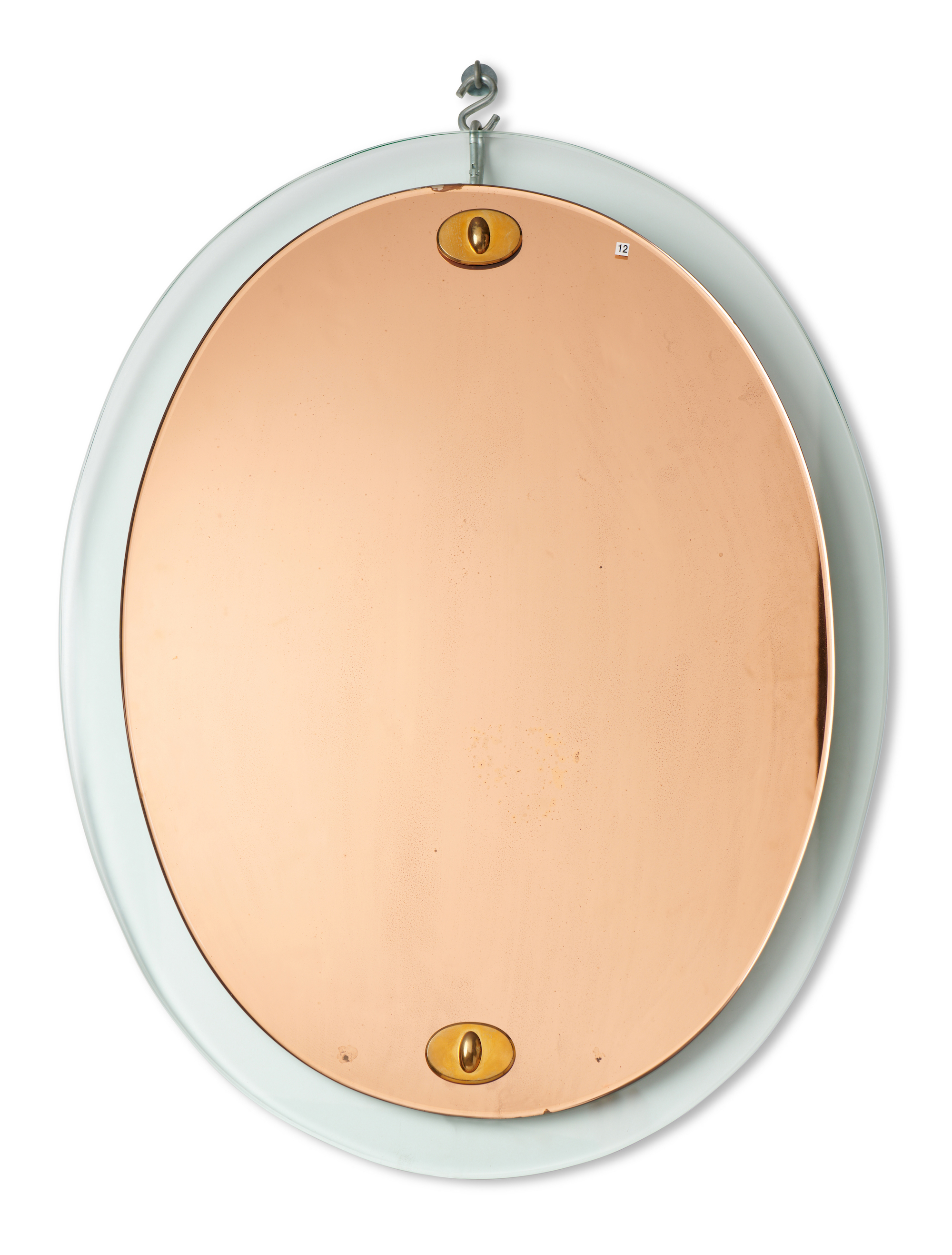 Oval mirror with copper front and brass fittings.