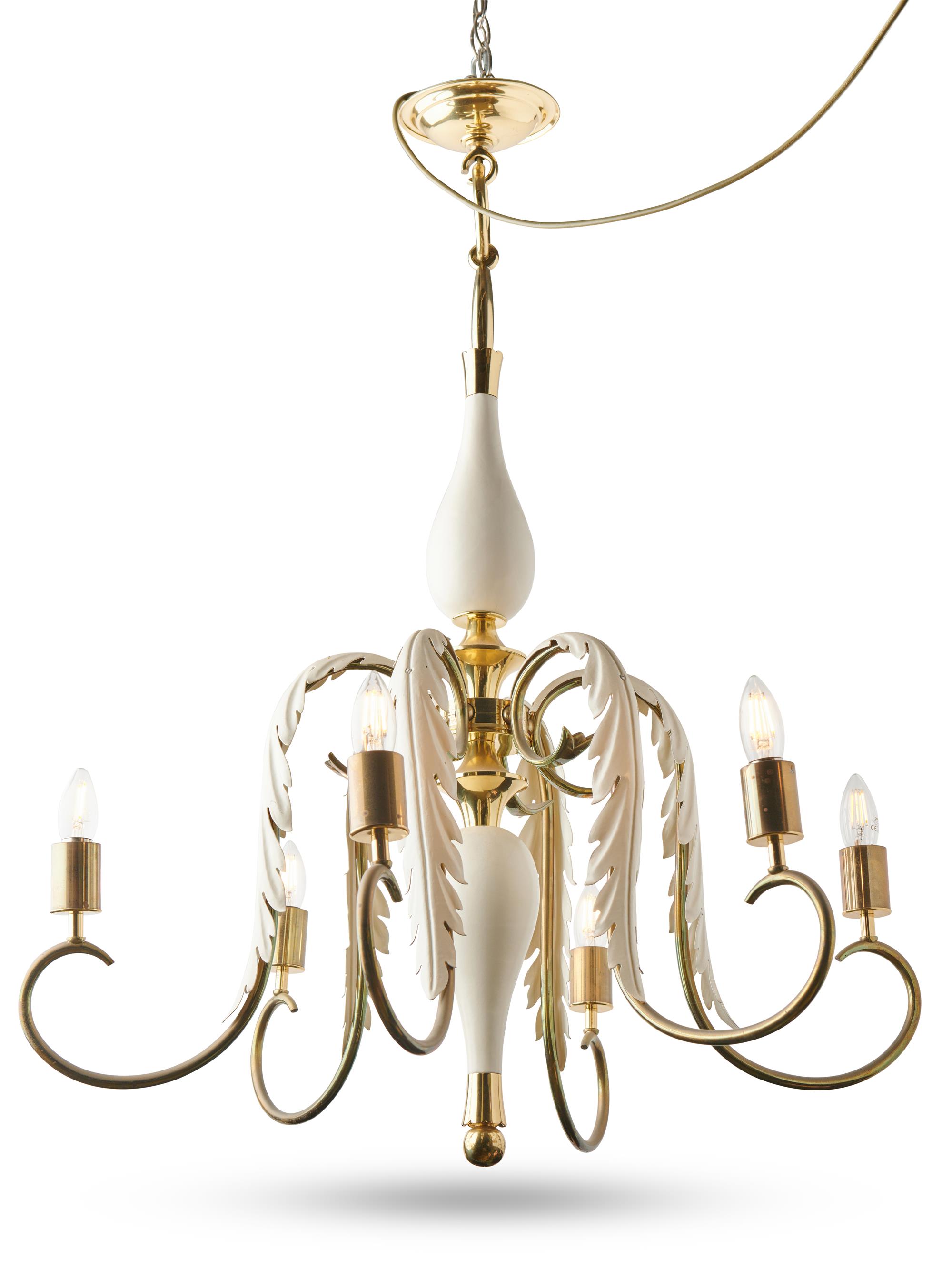 Six arms in brass, painted metal, and wood.