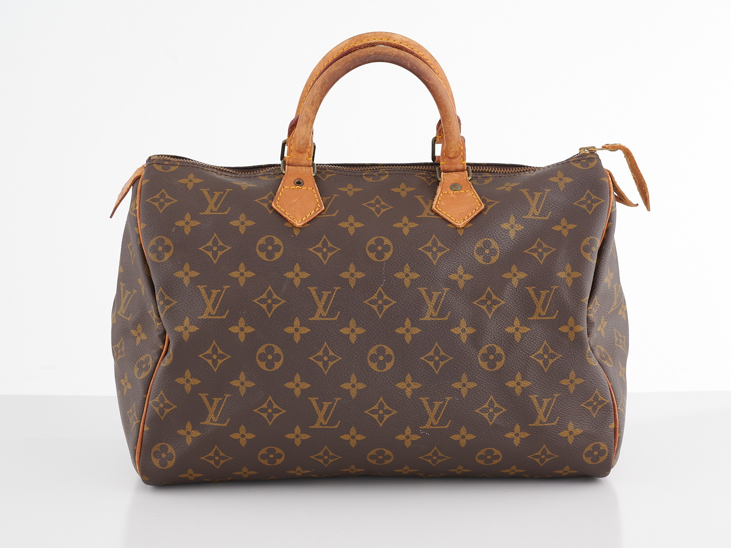 LOUIS VUITTON, MONOGRAM SPEEDY 35 - Styled in classic monogram leather with brass hardware and canvas interior, 22 x 35 x 18cm.