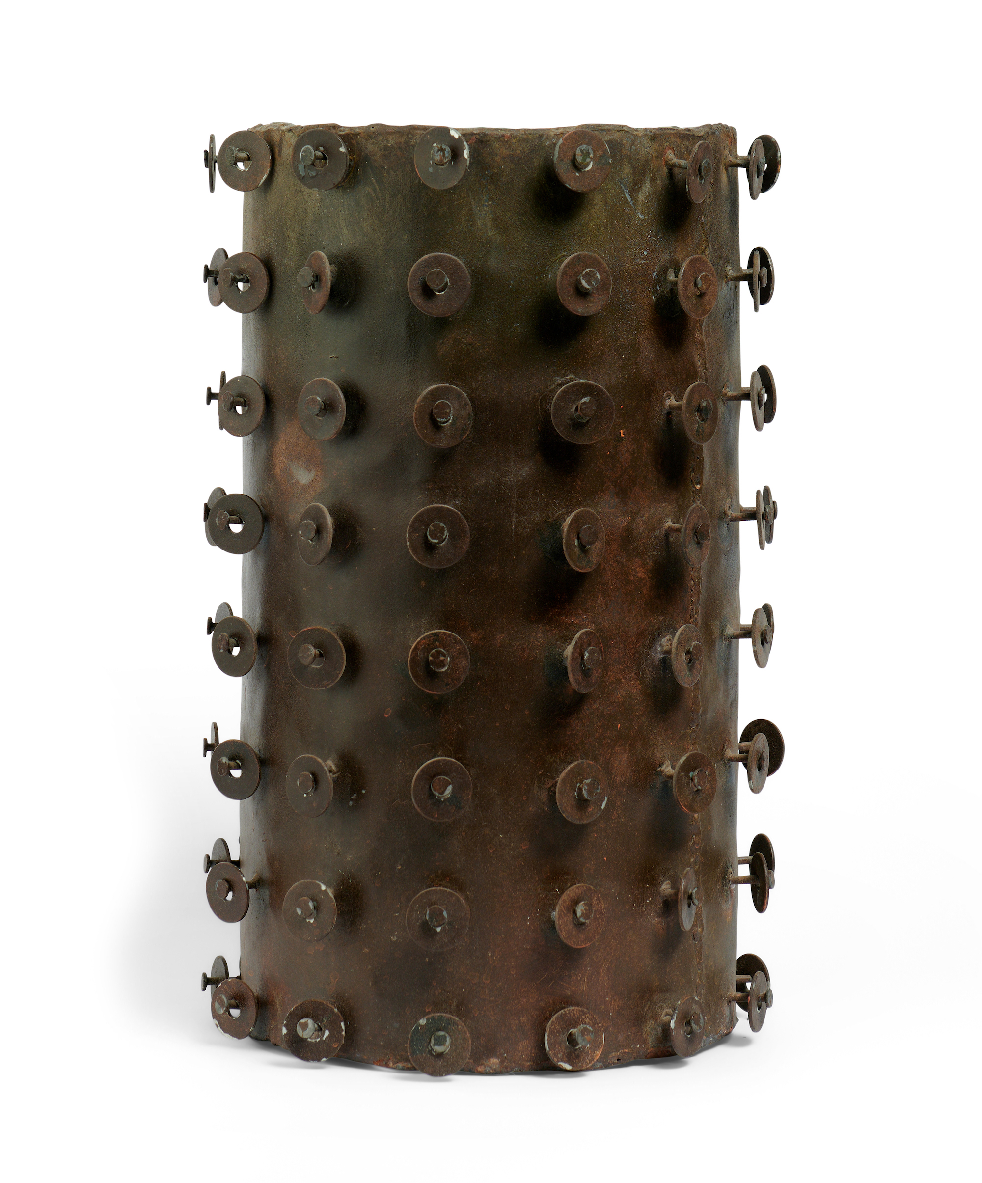 Marks and surface scratches present throughout, all consistent with the age and previous use of the vase. Some small losses to the coating in various locations. Minor patina development. The vase has no major losses and all the fittings are all present.