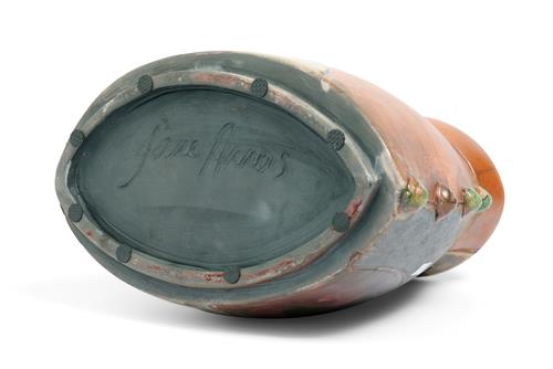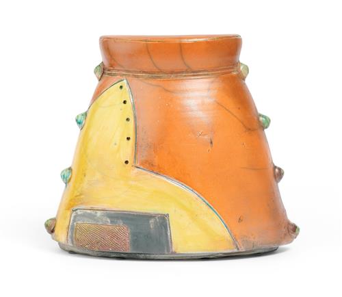 Glazed in orange, yellow, and blue tones (signed to base).