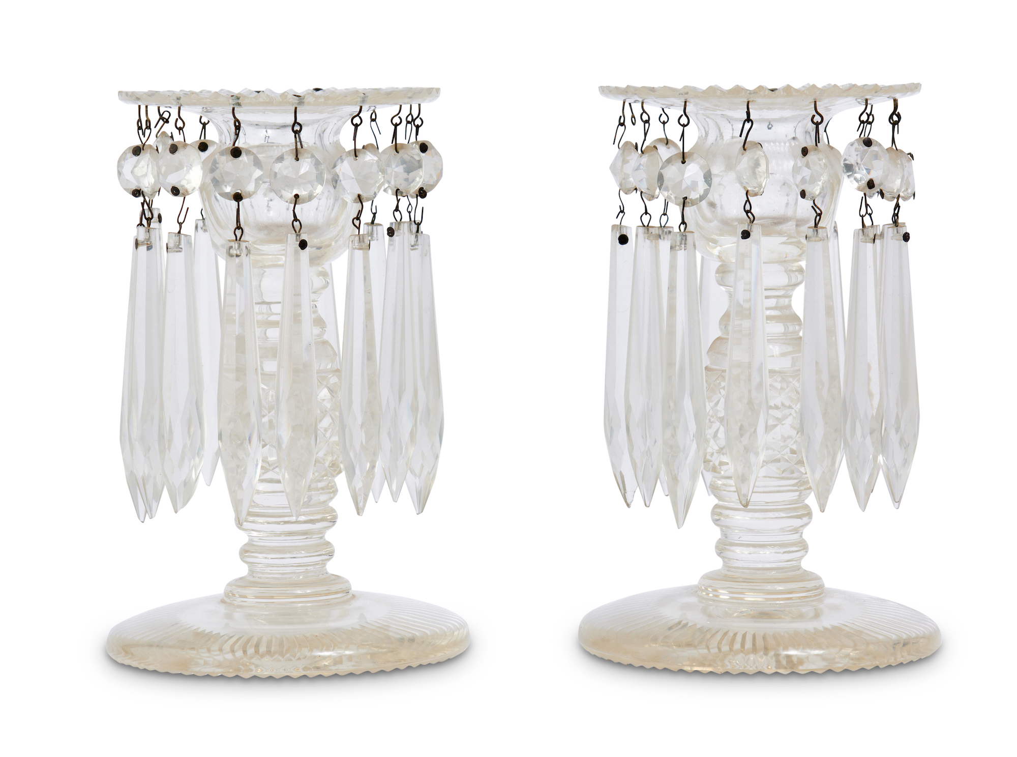 Some minor surface scratches and chips to lustre tops. Missing one drop to one candle holder. Consistent with age and use.