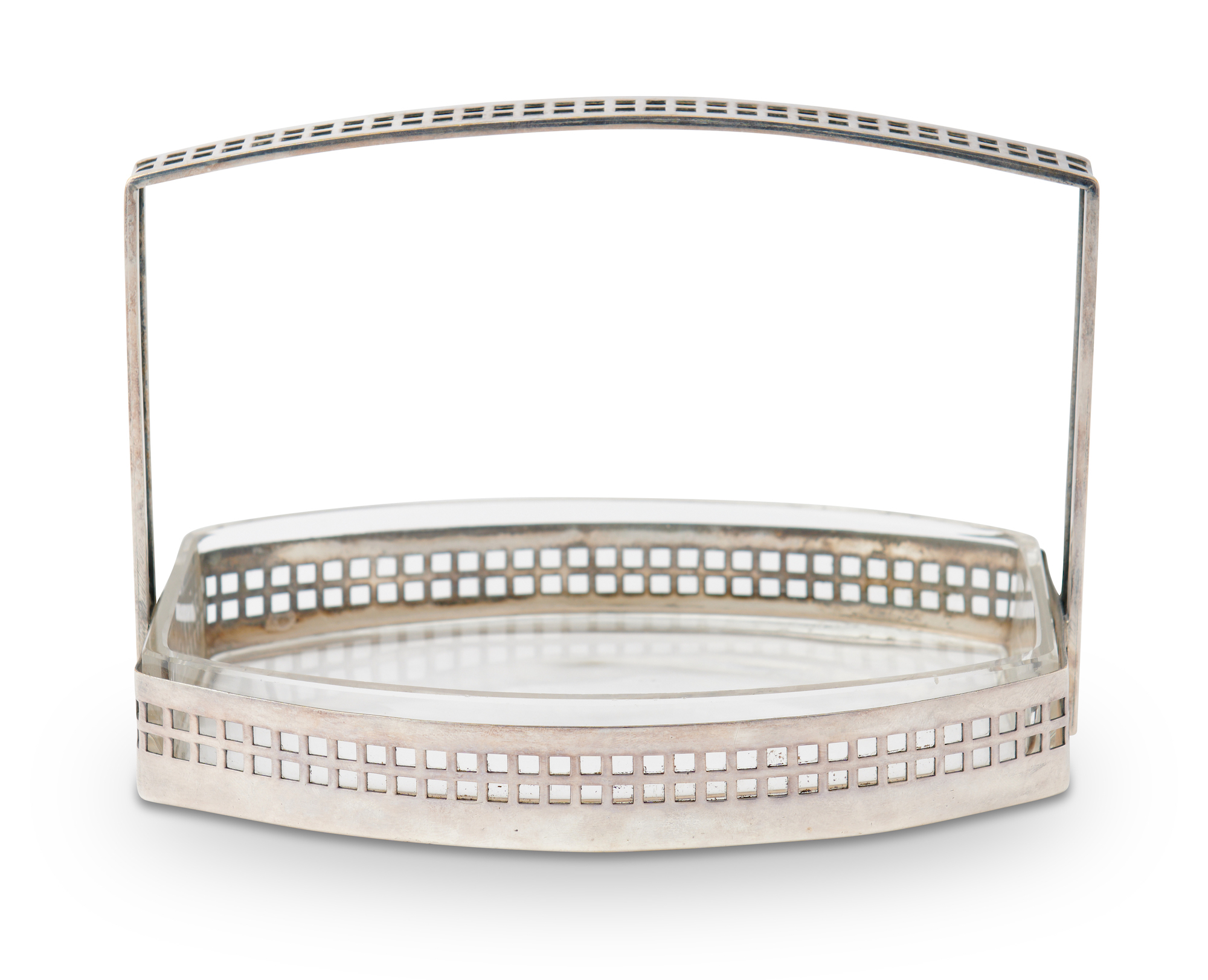 Silver plated gridwork basket with glass liner. Marked BEPWF 3821.