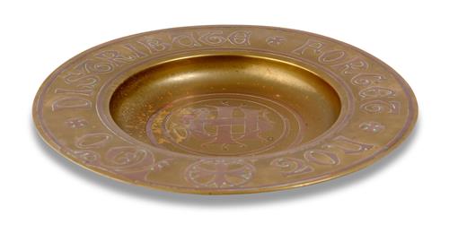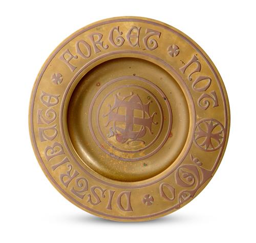 Brass charger, Augustus Pugin style 'Forget Not To Distribute'.
