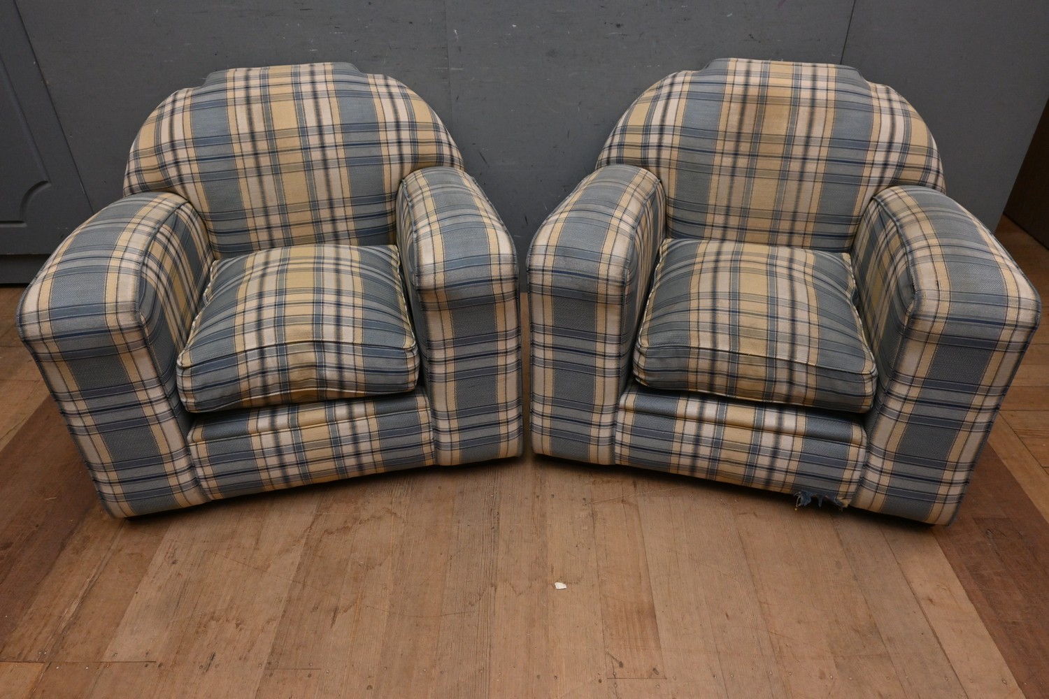 A PAIR OF SUBSTANTIAL ART DECO UPHOLSTERED CLUB CHAIRS (A/F) (78H X 98W X 95D CM) (PLEASE NOTE THIS HEAVY ITEM MUST BE REMOVED BY CLIENTS OR CARRIERS AT THE CUSTOMERS EXPENSE. LEONARD JOEL STAFF CANNOT ASSIST CARRYING THIS ITEM)