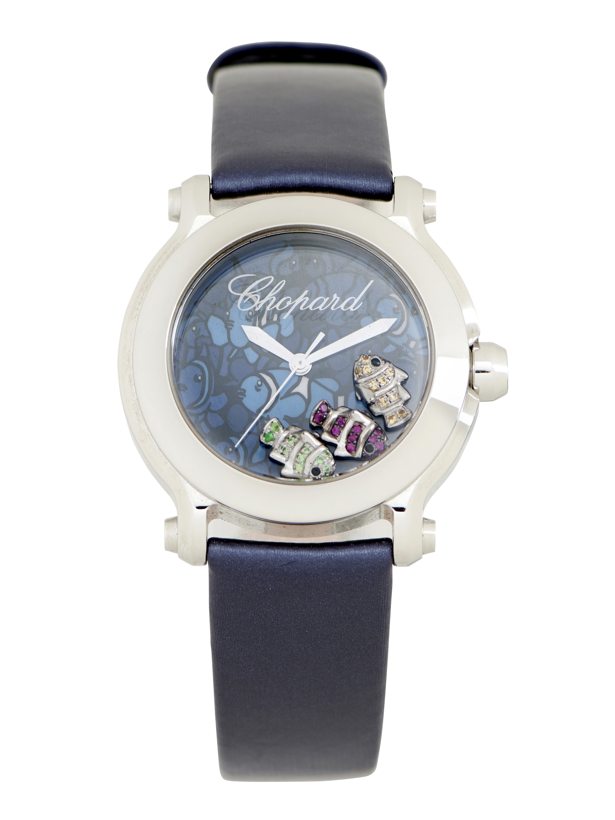 Dial: blue with fish motif throughout, three gem-set free floating fish