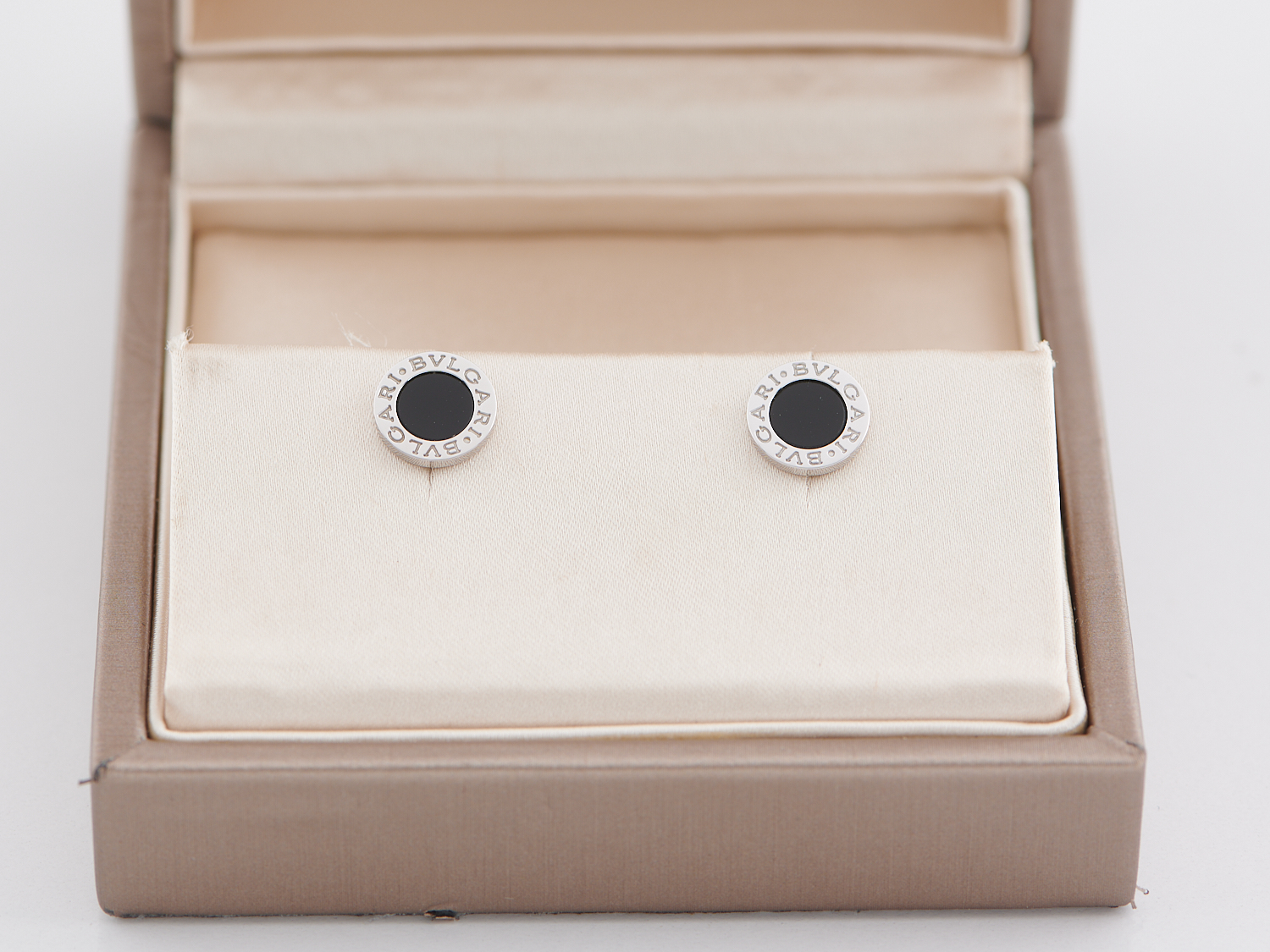 BVLGARI, BVLGARI BVLGARI STUDS - The rounds discs styled in 18ct white gold and onyx, with bezels engraved BVLGARI BVLGARI, to post fittings, boxed.
