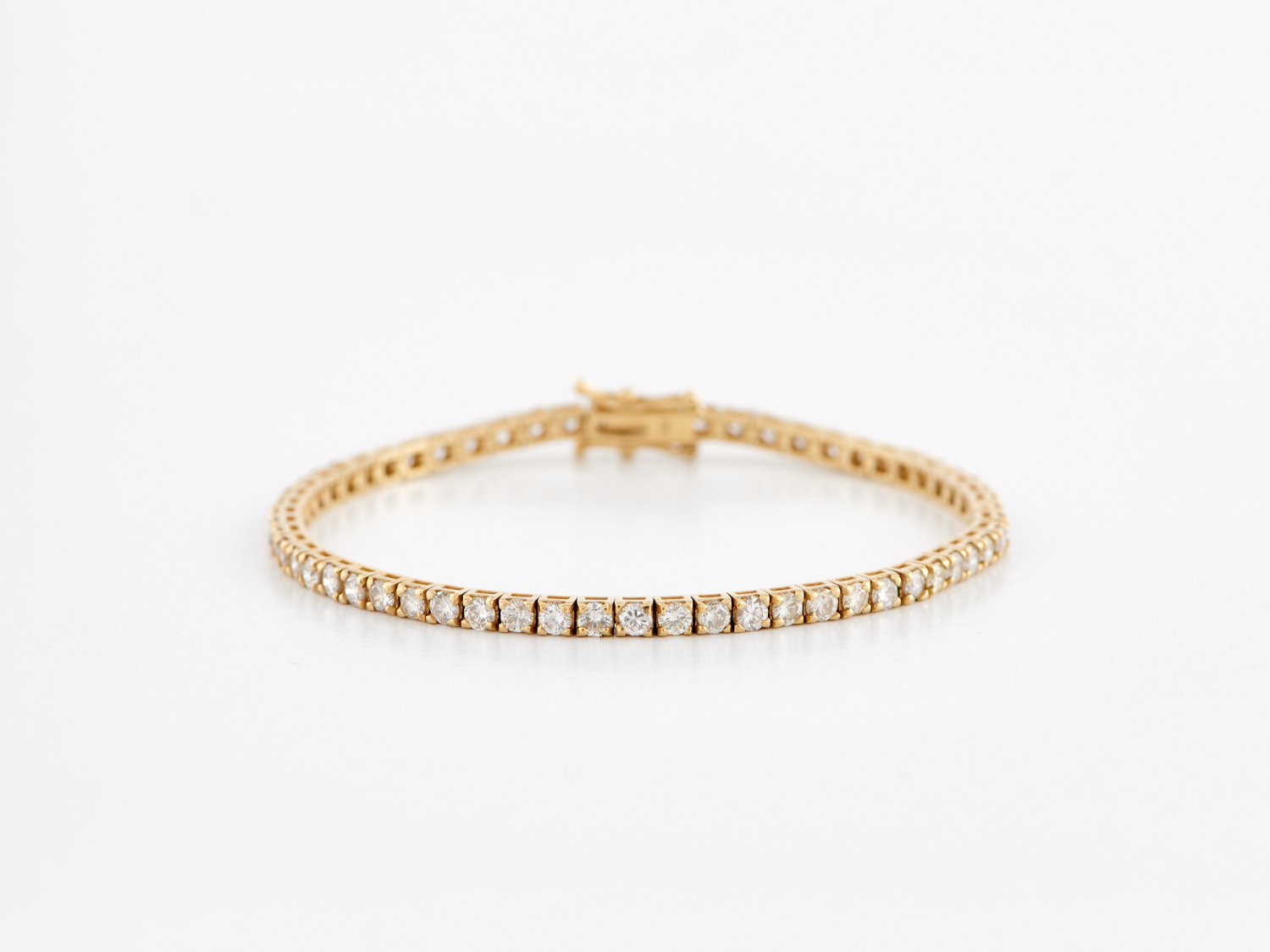 A DIAMOND LINE BRACELET IN 28CT GOLD COMPRISING FIFITY-SIX ROUND BRILLIANT CUT DIAMONDS TOTALLING 5.58CTS, APPROXIMATE LENGTH 180MM, APPROXIAMTE WEIGHT 11.14GMS