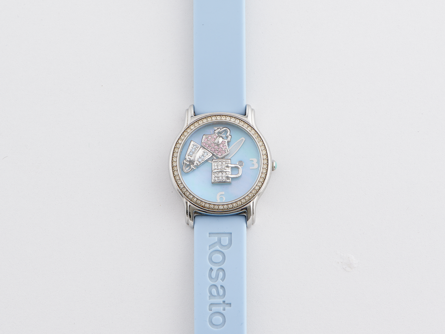 A WRISTWATCH BY ROSATO, STYLED WITH A DIAMENTE FRAME STAINLESS STEEL CASE, MOTHER OF PEARL FACE WITH FLOATING BAG CHARMS TO A PALE BLUE SILICONE STRAP, APPROXIMATE LENGTH 24CM, WITH ORIGINAL DENIM BAG AND PAPERS, QUARTZ MOVEMENT