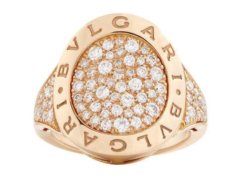 Comprising a concave shield, pavé set with round brilliant cut diamonds within a polished gold border engraved BVLGARI between pavé set diamond shoulders, signed Bulgari and numbered 2337AL, size P (58), accompanied by Bulgari box and papers.