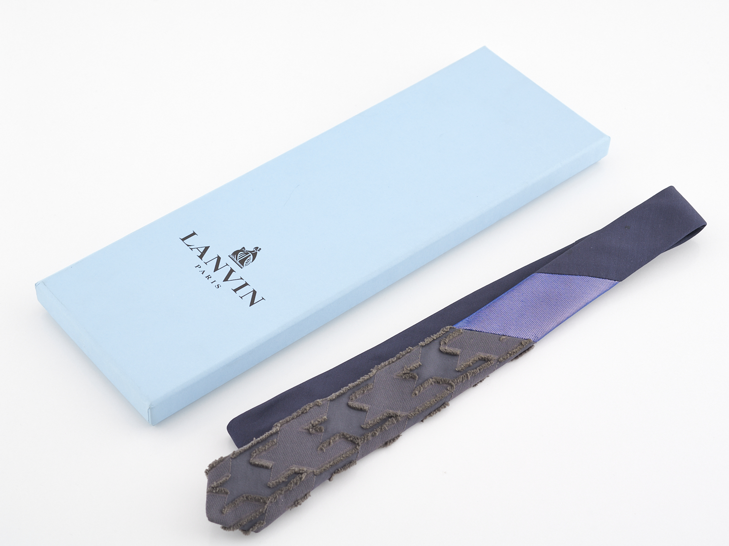 LANVIN, SILK TIE - Styled in navy silk, featuring blue metallic detail and terminating in grey star patterned silk, boxed.