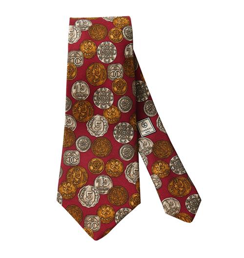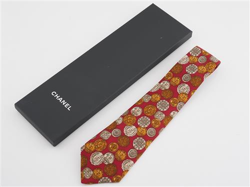 CHANEL, SILK TIE - Styled in red silk, featuring gold and silver coin print, boxed.