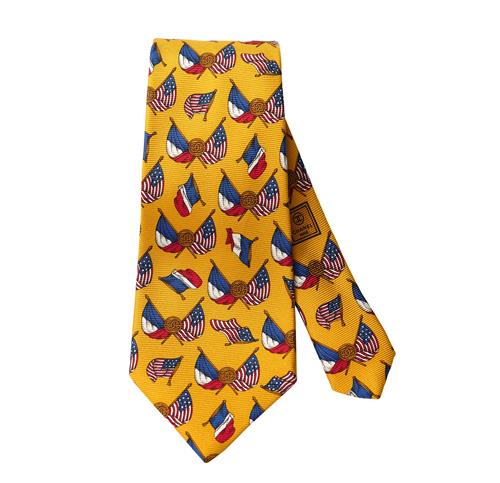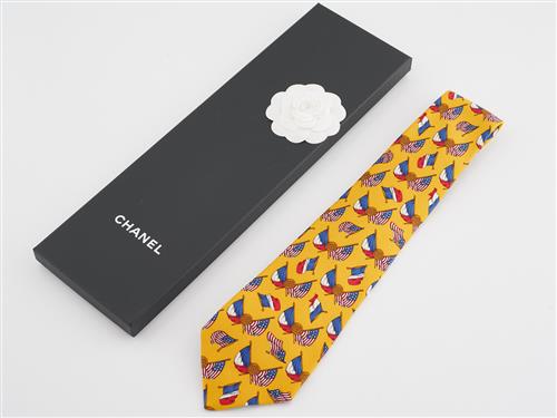 CHANEL, SILK TIE - Styled featuring the flags of the USA and France on a yellow background, boxed.