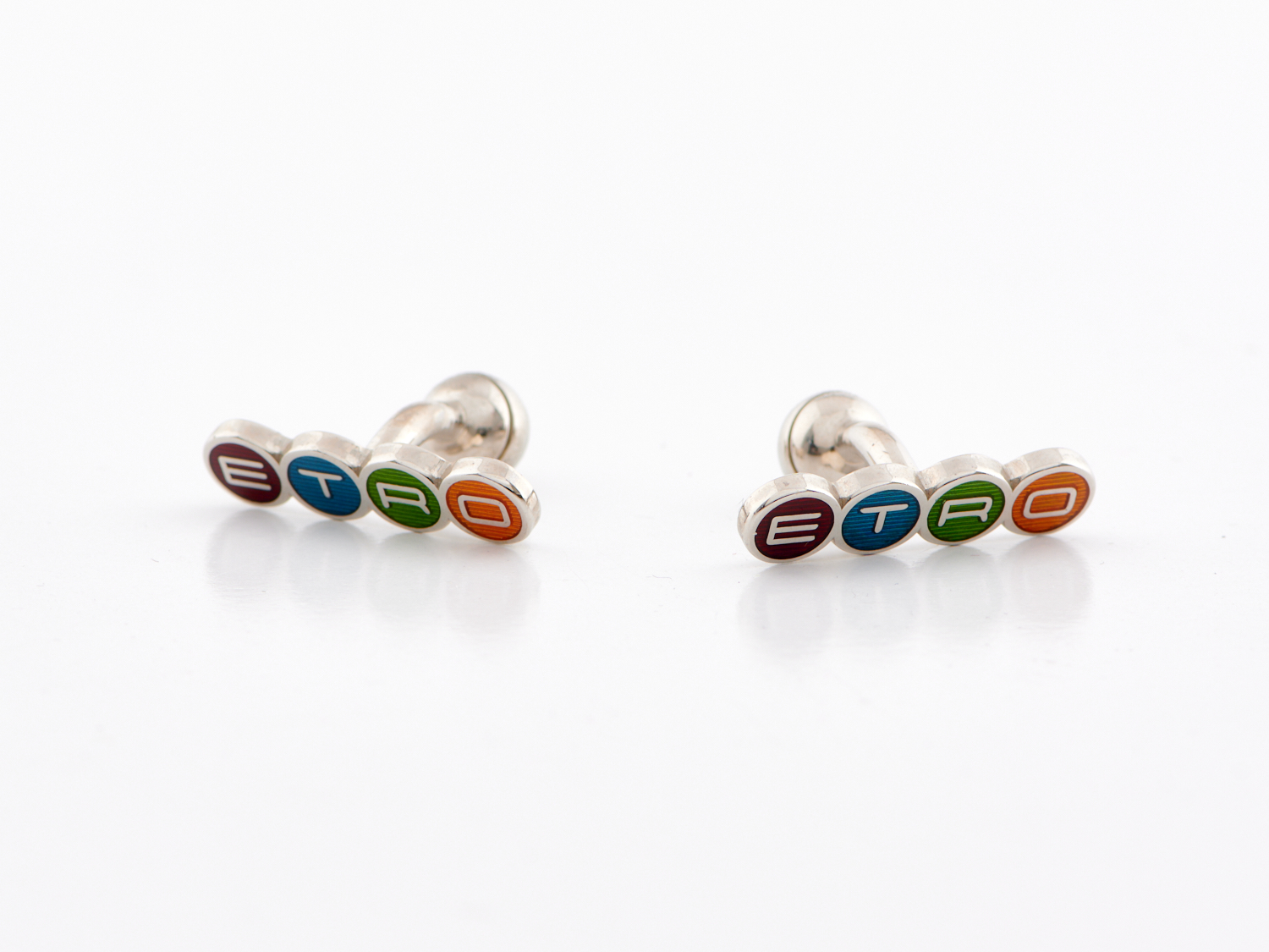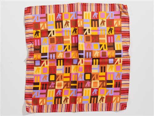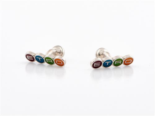 ETRO, SILK HANKERCHEIF AND CUFFLINKS - The hankercheif styled in retro style brown and orange tonal print, with rolled edges, 43cm squared, along with a pair of Etro cufflinks in silver tone metal.