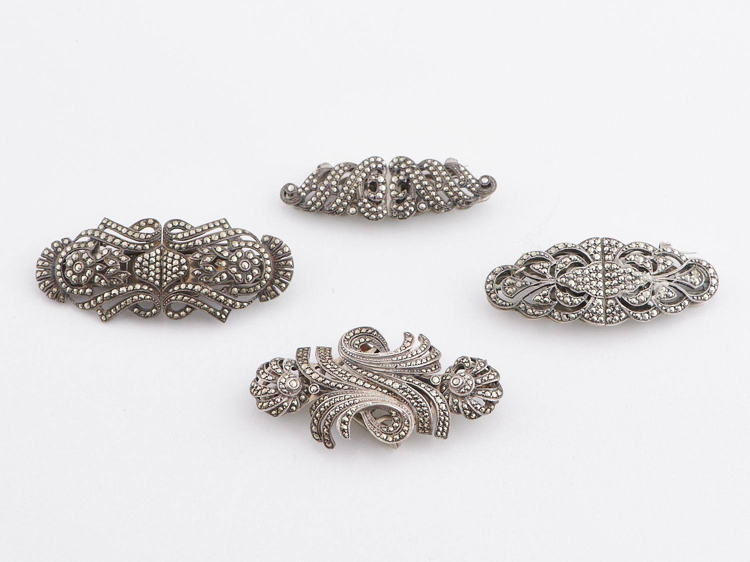 A COLLECTION OF FOUR MARCASITE DRESSCLIPS IN STERLING SILVER, CONVERTIBLE TO BROOCHES