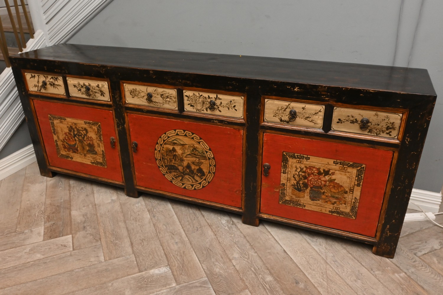 A SUBSTANTIAL HAND PAINTED MONGOLIAN SIDEBOARD (90H X 240W X 46D CM) (PLEASE NOTE THIS HEAVY ITEM MUST BE REMOVED BY CLIENTS OR CARRIERS AT THE CUSTOMERS EXPENSE. LEONARD JOEL STAFF CANNOT ASSIST CARRYING THIS ITEM)