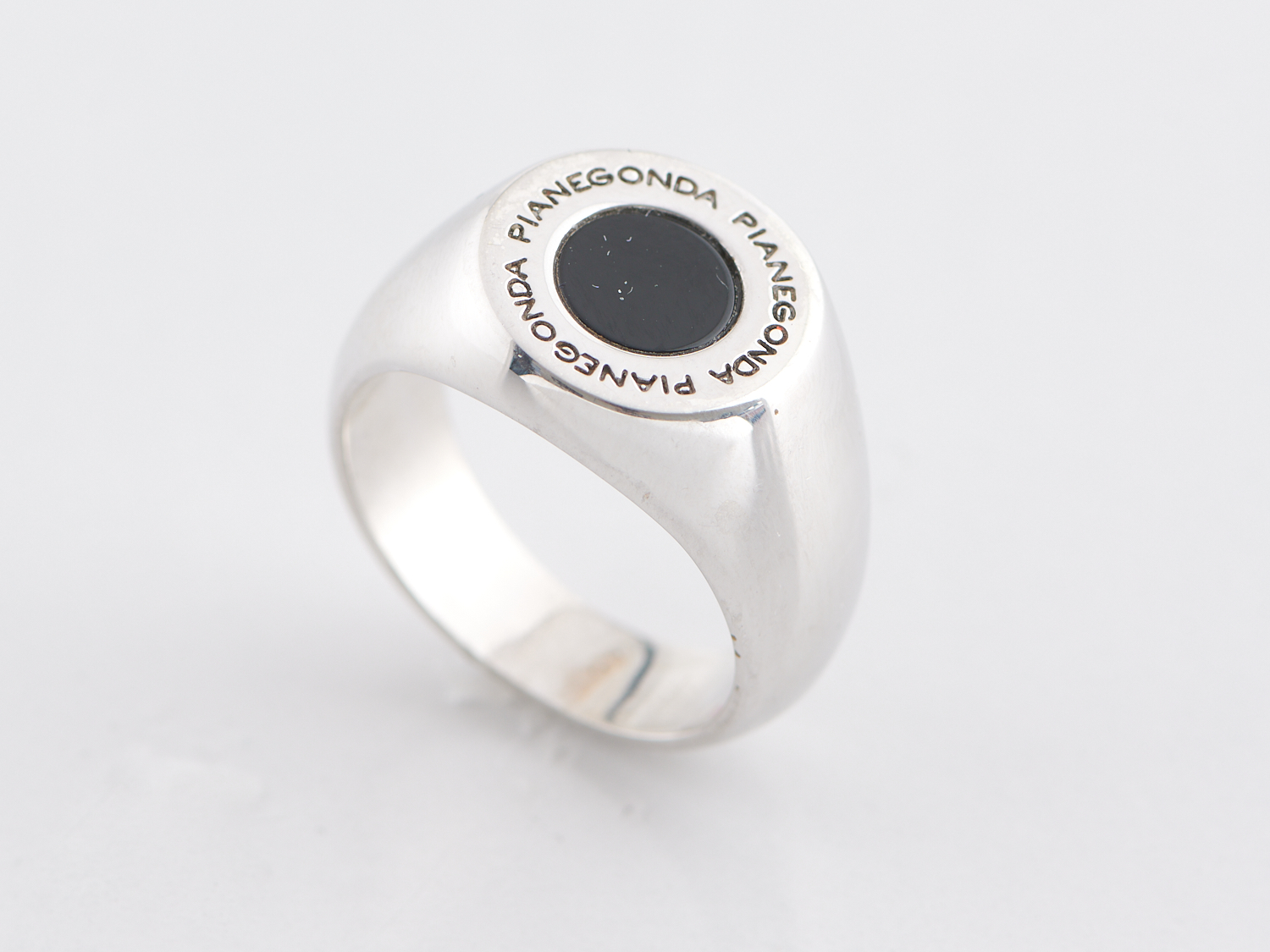 PIANEGONDA, RING - A signet ring in sterling silver with black onyx disc, ring size U.