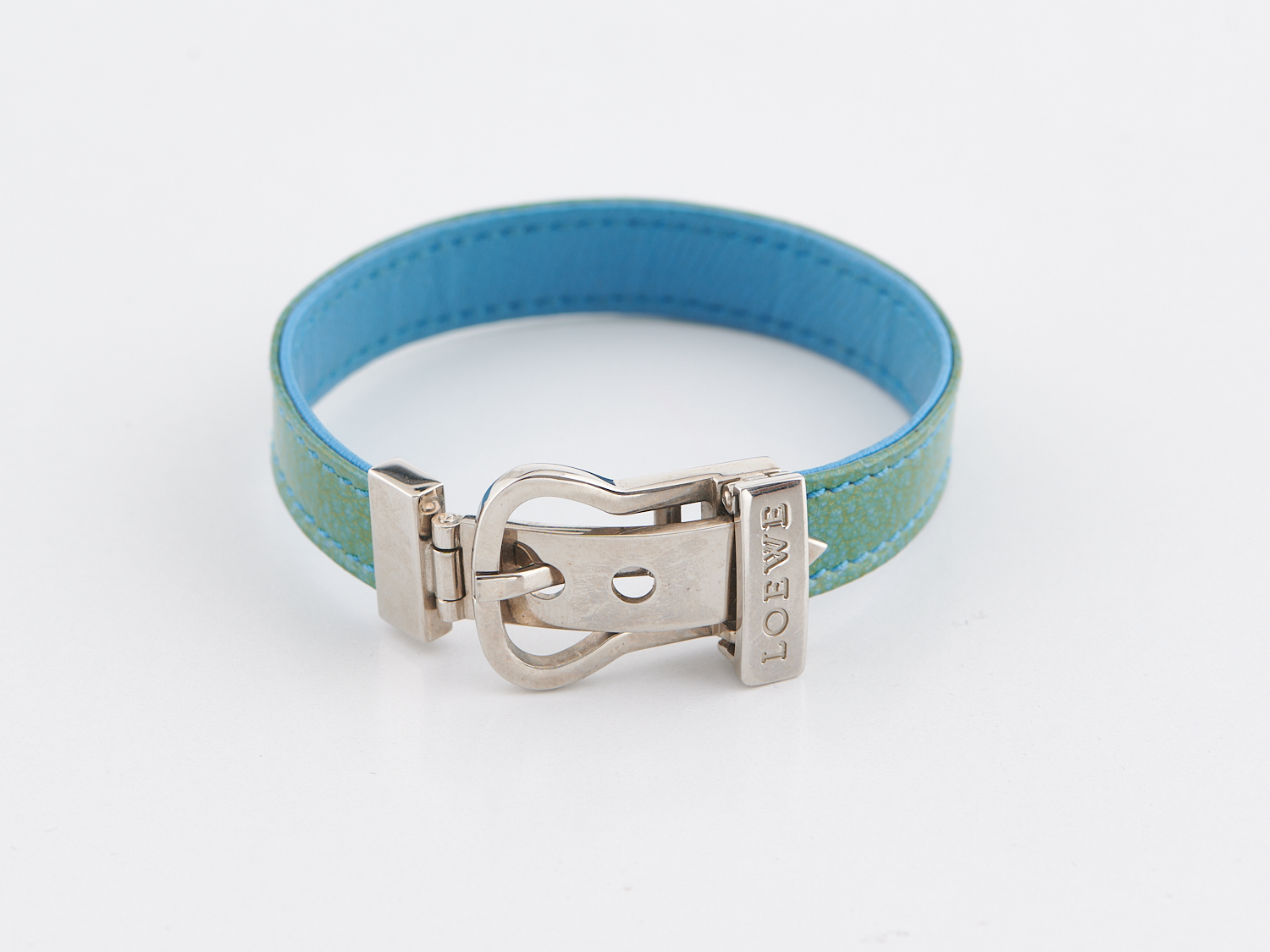 LOEWE, A BRACELET - A patent leather braclet in duck egg blue with green overtone, to a buckle clasp in silver tone metal, approximate length 20cm.