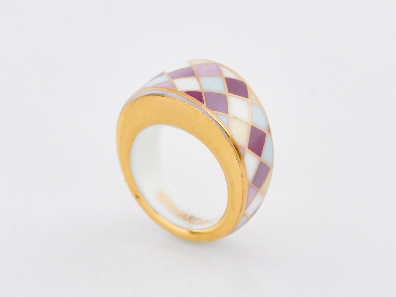 A RING IN PORCELAIN BY BERNARAUD WITH HARLEQUIN DESIGN, SIZE O