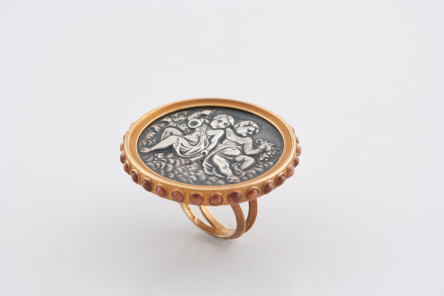 BOTTEGA VENETA, DRESS RING - A large ancient roman medallion style ring featuring two cherubs in a goldstone cabochon studded frame, ring size K, boxed.