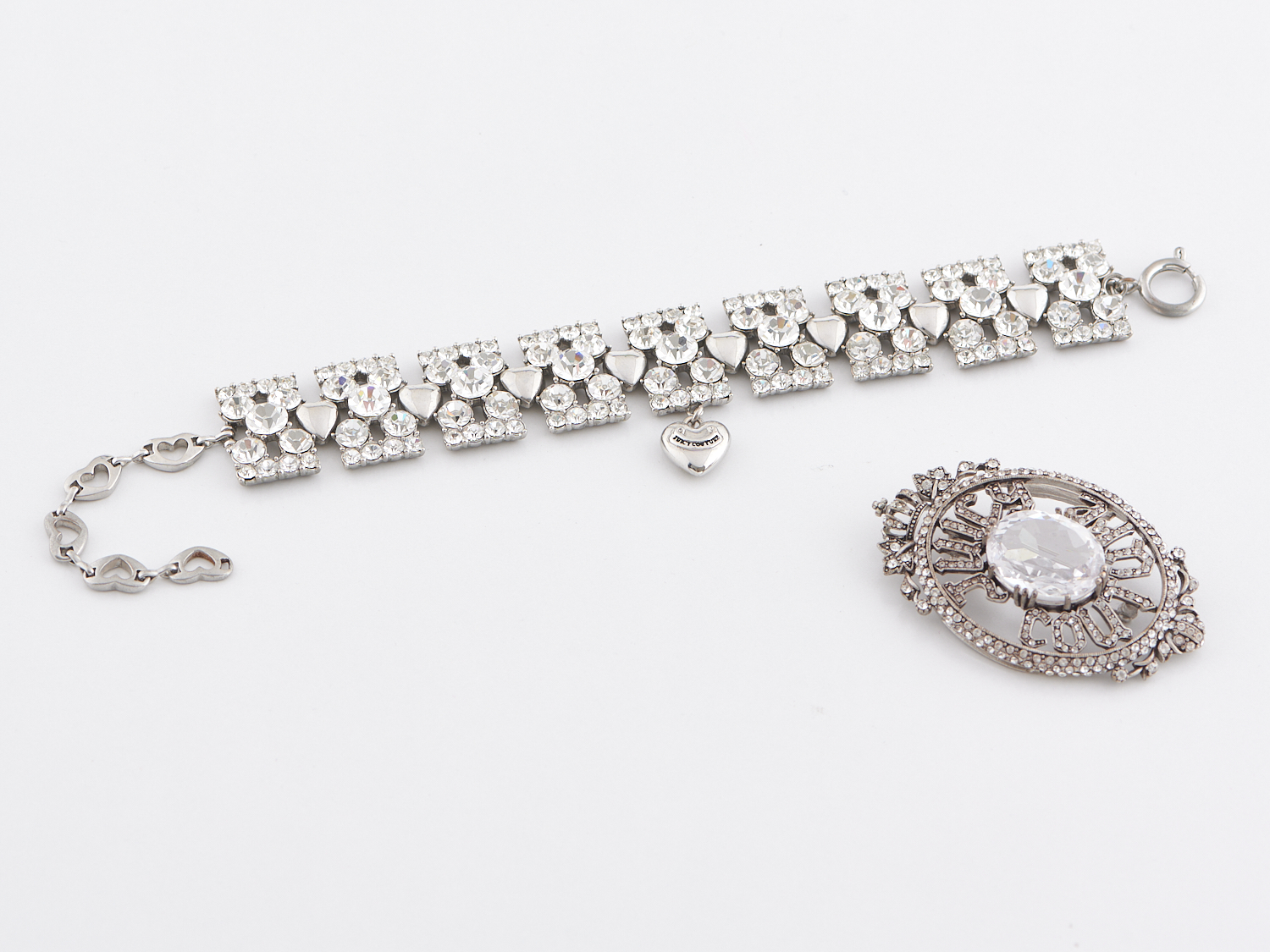 JUICY COUTURE, BROOCH AND BRACELET - A diamente and silver tone segment bracelet with heart shaped spacers, approximate size 2.5 x 20 - 27cm, together with a silver tone oval shape diamente brooch with crown and large centre stone, approximate size 4 x 7cm.