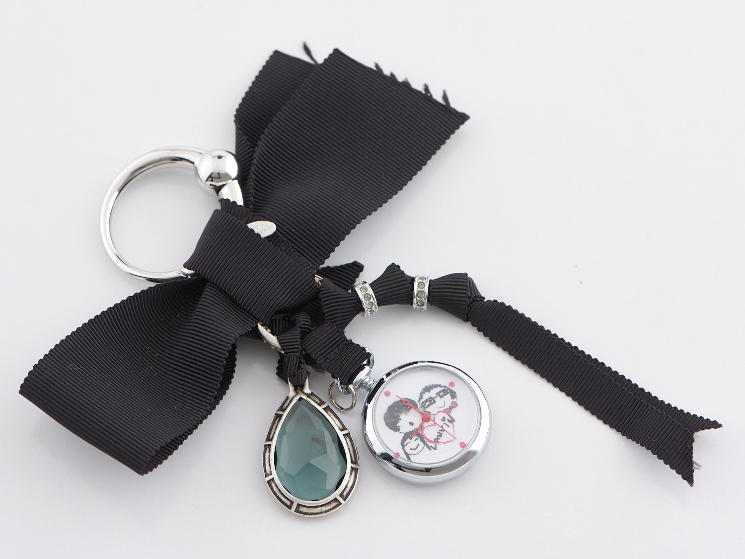 LANVIN, KEY RING - Styled in silver tone metal with black grosgrain ribbon, blue crystal pendant, and pocket watch pendant.