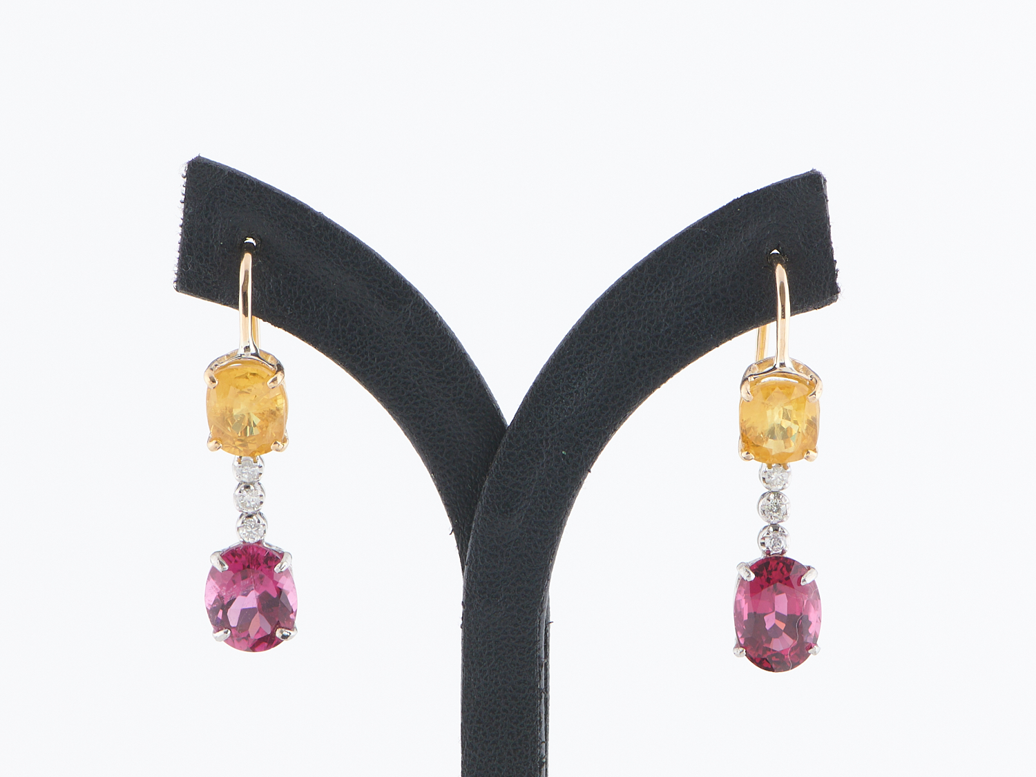 A PAIR OF RUBELLITE TOURMAILNE (6.18CTS), YELLOW SAPPHIRE (5.80CTS) AND DIAMOND (0.22CTS) EARRINGS IN 18CT TWO TONE GOLD, TO SHEPHERD HOOK FITTINGS, LENGTH 35MM
