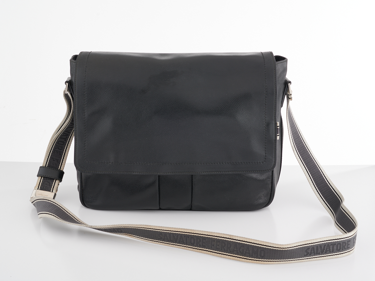 SALVATORE FERRAGAMO, MESSENGER BAG - Styled in black embossed leather, with front flap closure and grosgrain shoulder strap, 30 x 42 x 10cm.
