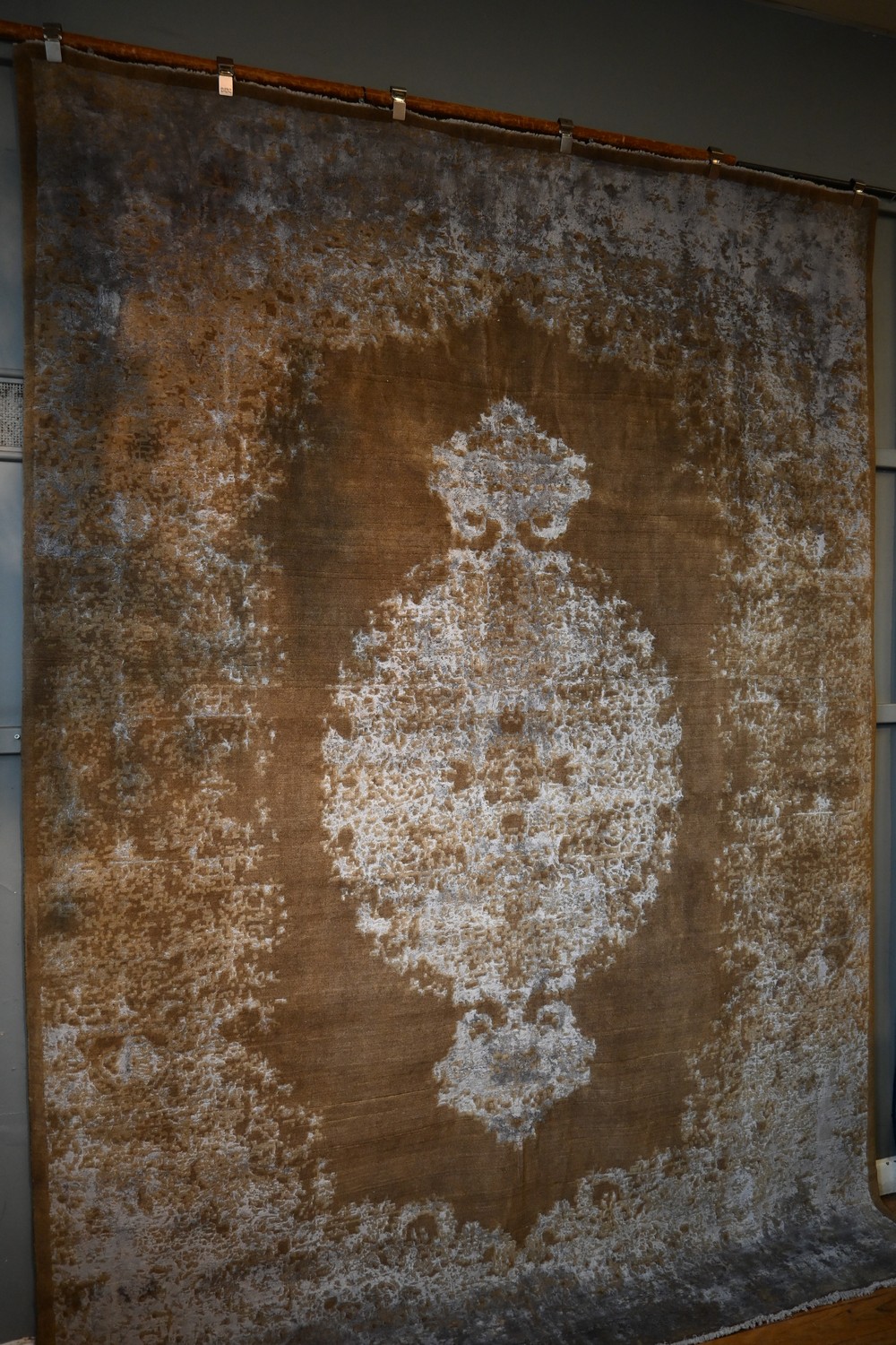 A MODERN TRANSITIONAL PERSIAN KERMAN DESIGNER RUG. FINELY WOVEN IN IRAN. 100 % WOOL PLUSH PILE. CENTRAL ELONGATED MEDALLION AND A BORDER OF PALMETTES FLORAL SPRAYS. IN TONES OF CARAMEL, PLATINUM, AND GOLD. SIZE: 340 X 247 CM ORIGIN: PERSIA - RRP: $7,900 DOCUMENTATION OF AUTHENTICITY INCLUDED.