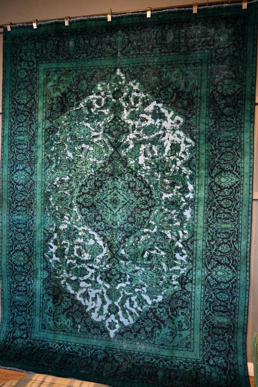 A SPECTACULAR CONTEMPORARY VINTAGE OVERDYED PERSIAN KASHAN CARPET. A UNIQUE & INDIVIDUAL MODERN CARPET CREATED FROM AN AUTHENTIC FINELY HAND-KNOTTED VINTAGE PERSIAN KASHAN CARPET WITH A CLASSIC DESIGN OF ELONGATED MEDALLION WITHIN AN OPEN FIELD OF FLORAL SPRAYS. THE PILE IS SLIGHTLY SHORN IN TONES OF EMERALD GREEN AND NAVY. SIZE: 340 X 234 CM ORIGIN: PERSIA - RRP: $8,700 DOCUMENTATION OF AUTHENTICITY INCLUDED.