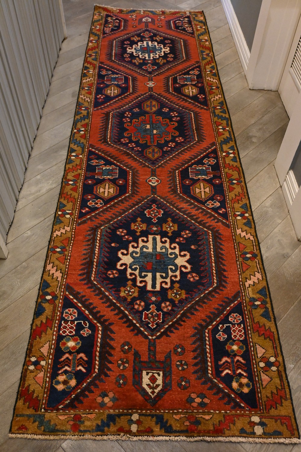 A CIRCA 1950'S PERSIAN HERIZ RUNNER. VINTAGE PILE, NATURAL DYES, 100% HAND SPUN WOOL. CONTINUING TRIPLE ANCHORED MEDALLIONS IN BLUE TONES ON A SOFT RED FIELD. BORDER OF GEOMETRIC DESIGNS. VIVID COLOUR TONES ALL OVER. SOME RESTORATION. SIZE: 373 X 106 CM ORIGIN: PERSIA - RRP: $3,900 DOCUMENTATION OF AUTHENTICITY INCLUDED