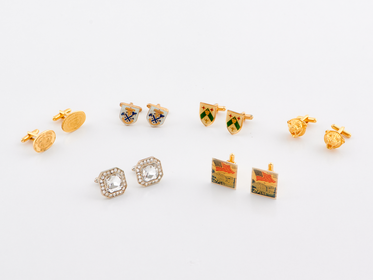 A COLLECTION OF SIX PAIRS OF VINTAGE CUFFLINKS IN GOLD TONE METAL, INCLUDING BARBOUR, RAFFLES HOTEL SINGAPORE, AND CRYSTAL SET
