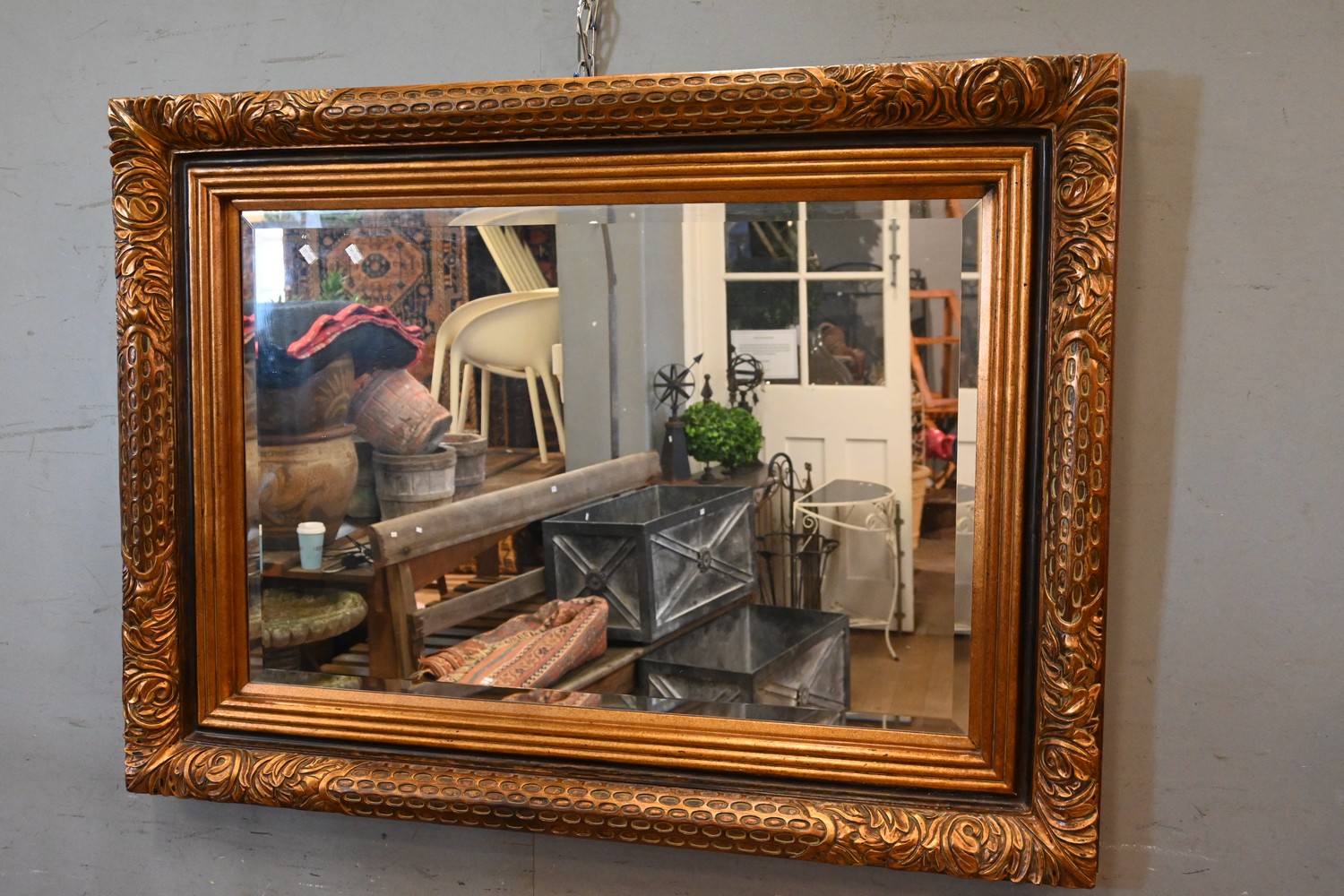 A LARGE BEVELLED WALL MIRROR IN A CARVED AND GILT FRAME (A/F) (88H X 119W CM) (LEONARD JOEL DELIVERY SIZE: LARGE)