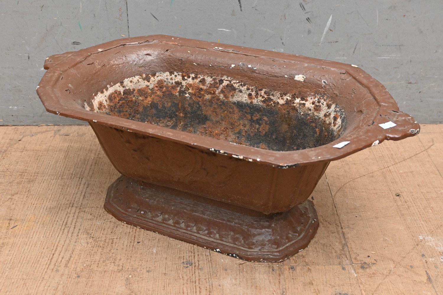 A 19TH CENTURY FRENCH CAST IRON PLANTER WITH FOLIATE RAISED DECORATION TO SIDE (A/F) (25H X 63W X 34D CM) (LEONARD JOEL DELIVERY SIZE: LARGE)
