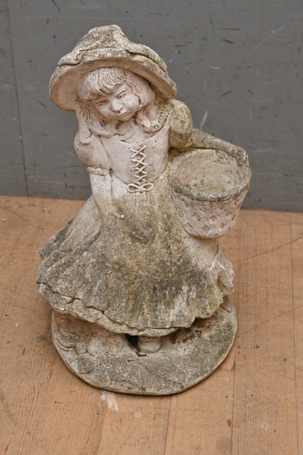AN EARLY 20TH CENTURY FRENCH RECONSTITUTED STONE FIGURE OF GIRL WITH BASKET (62H CM) (PLEASE NOTE THIS HEAVY ITEM MUST BE REMOVED BY CLIENTS OR CARRIERS AT THE CUSTOMERS EXPENSE. LEONARD JOEL STAFF CANNOT ASSIST CARRYING THIS ITEM)