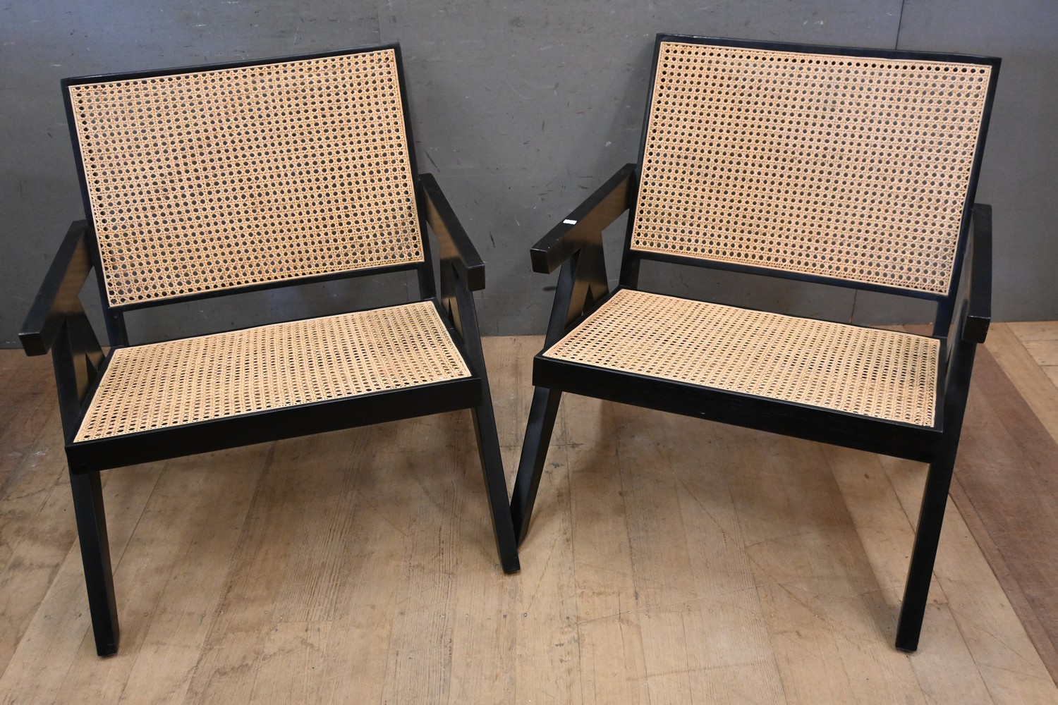 A PAIR OF TEAK AND RATTAN LOUNG CHAIRS (76H X 74W X 85D CM) (LEONARD JOEL DELIVERY SIZE: X-LARGE)