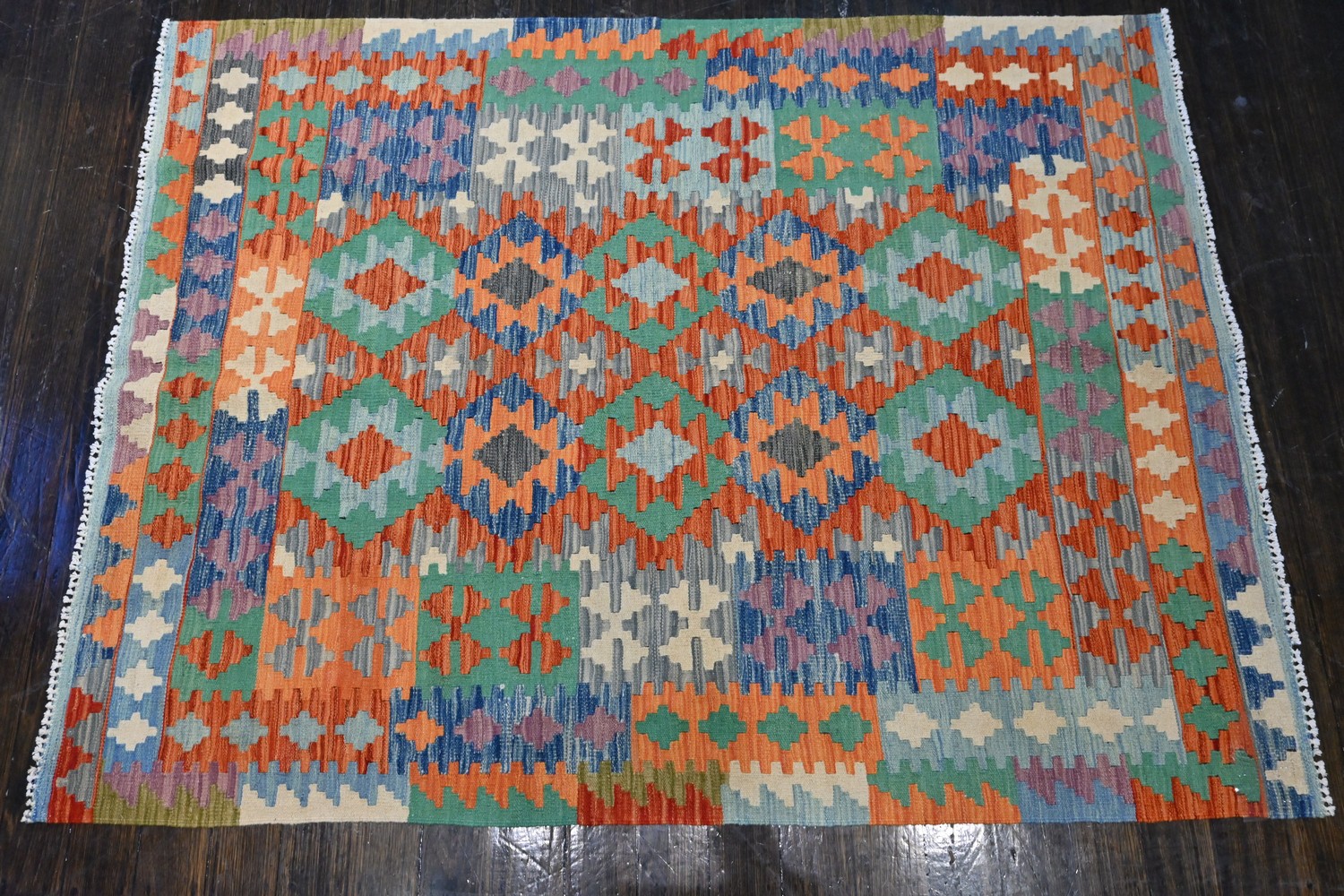 A HANDWOVEN CAUCASIAN DESIGN 100% WOOL, REVERSABLE KILIM IN ALL NATURAL DYES (198 X 148 CM) (LEONARD JOEL DELIVERY SIZE: LARGE)