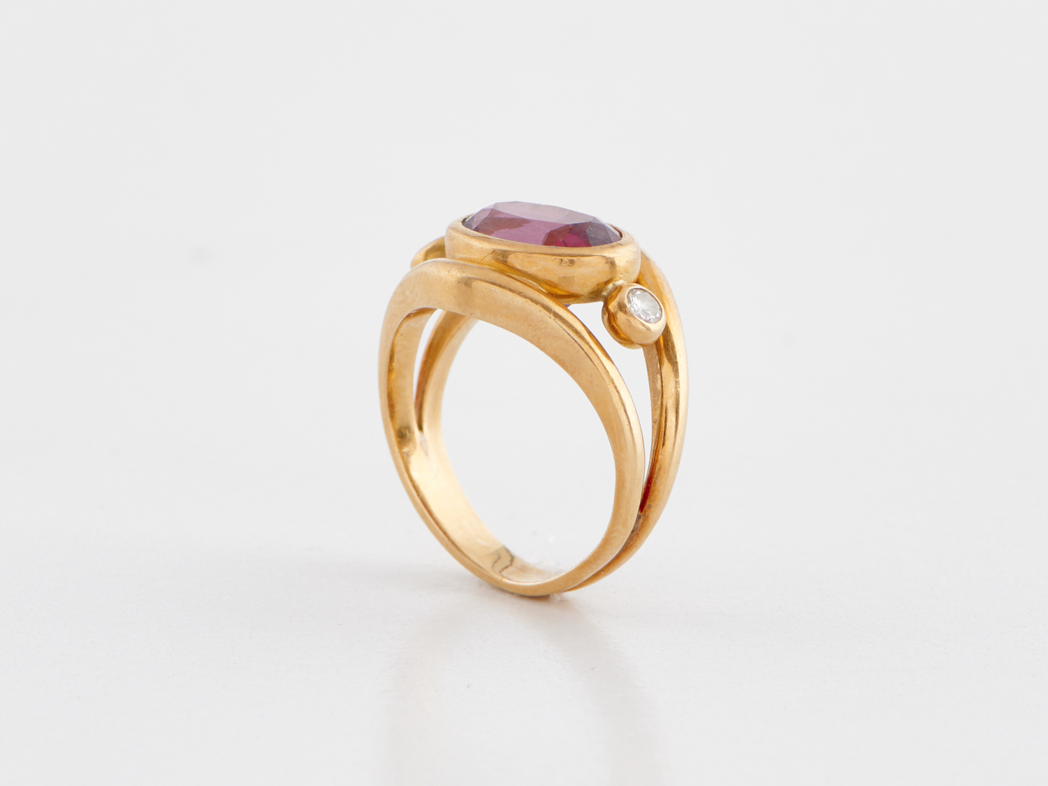 A GARNET AND DIAMOND RING IN 18CT GOLD, SIZE L, 7.6GMS