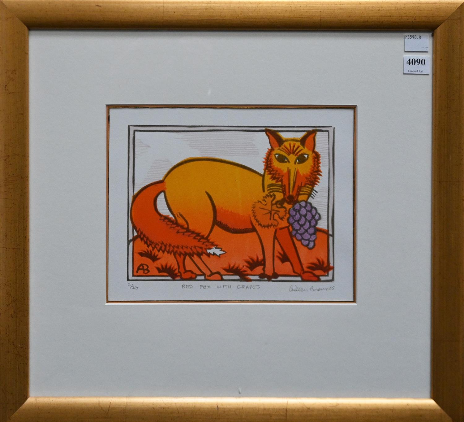 AILEEN BROWN, RED FOX WITH GRAPES 2005, LINOCUT 2/20, 15 X 20CM, FRAME SIZE: 41.5 X 45CM