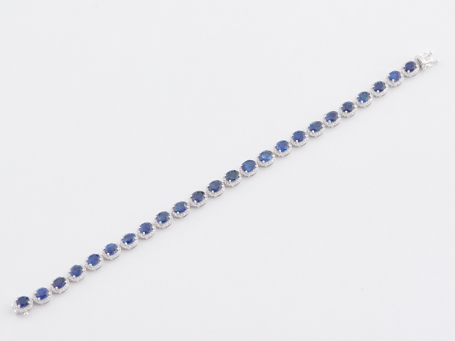 A SAPPHIRE AND DIAMOND BRACELET IN 18CT WHITE GOLD, THE SAPPHIRES TOTALLING 12.79CTS, THE DIAMONDS TOTALLING 1.45CTS, LENGTH 175MM, 13.6GMS