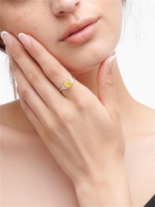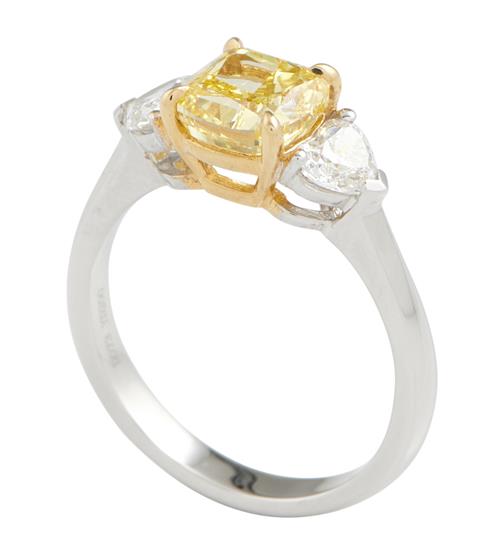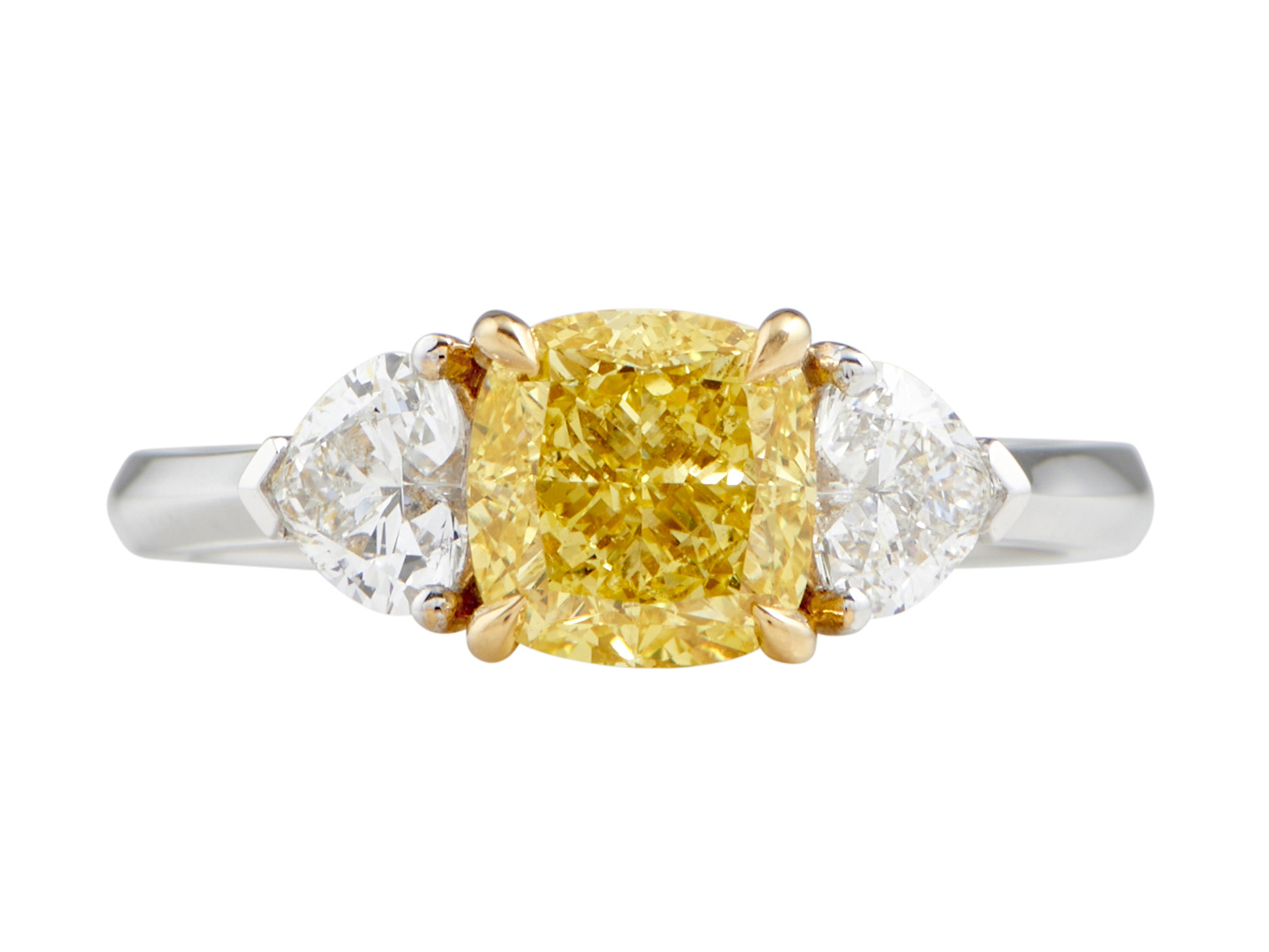 Centring a claw-set cushion-cut fancy vivid yellow diamond weighing 2.00 carats, flanked by corner claw-set heart-cut diamonds together weighing 0.73 carats, size N.