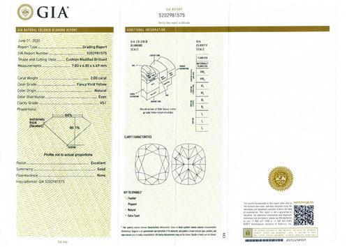 Accompanied by copy of GIA Natural Coloured Diamond Report number 5202981575 stating the 2.00 carat diamond is Fancy Vivid Yellow colour, VS1 clarity; copy of GIA Diamond Report number 535344520 stating the 0.36 carat diamond is colour D, Internally Flawless; copy of GIA Diamond Report number 6371026190 stating the 0.37 carat diamond is colour D, Internally Flawless.